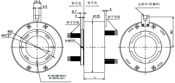 緊定螺絲固定。定子部分通過(guò)止轉(zhuǎn)片與設(shè)備固定部位連接。 |